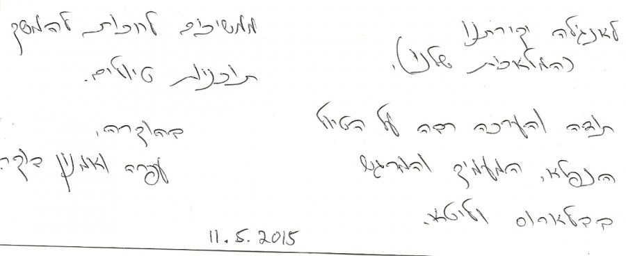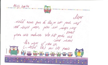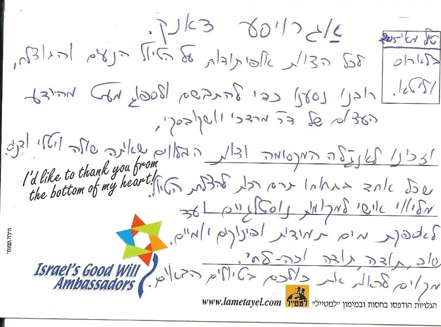 קיבלנו את ה"חג שמח" שלך ואני מאחלת לך מכל הלב חג שמח אמיתי, כי את ראוייה לו. תודה על ההתחשבות ותשומת הלב המיוחדת שהענקת לי. השיחות איתך, לפני הסמינר, עודדו אותי מאוד לצאת למשימה. ובאודסה, כאשר היו בעיות, תמיד היית ערה להן ופתרת אותן באופן הטוב ביותר. הסיורים היו מצויינים, המרצים היו מעניינים והאירגון היה נפלא.