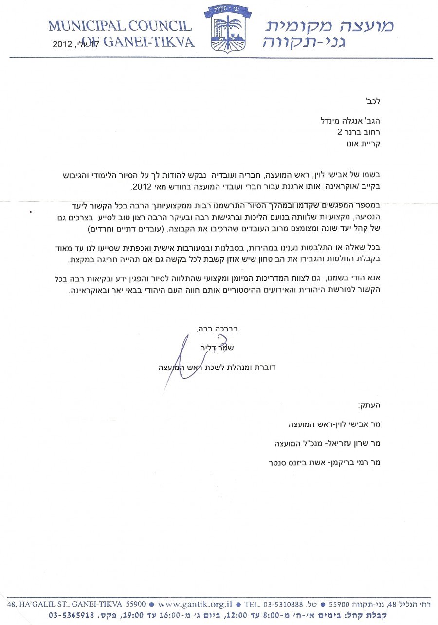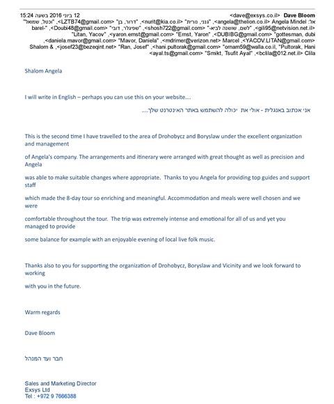 בתאריכים 20-27/7/13 ערכנו , מסע שורשים לאוקראינה : לבוב., האליץ , אוונו פרנקובסק , הקרפטים, רובנו, סרני, קלוסוב קרסין וקייב . היינו 10 בני משפחה: צעירים ומבוגרים. יצאנו לשם עם לא מעט חששות ויצאנו מחוזקים ועל כך אנו רוצים להודות לך אנג'לה מינדל על אירגון מסע זה. על המסלול המעניין , על המדריך אלכס שהיה נשמה טובה . על האוטו המרווח והממוזג . והנהג המצוין. על בתי המלון היפים והנוחים. נהנו מכל רגע . נהנו מאוקראינה מהאוויר ומהנוף הירוק והחמניות הצהובות . היו אפס תקלות. הכל היה כפי שתוכנן. המסע היה עבורנו חוויה מכוננת. למדנו להכיר את המקומות מהם באו ההורים, למדנו להעריך אותם יותר לאחר כל הסבל שעברו . כאשר נמצאים פיסית במקום הכל חד יותר וחודר. .. הזדהינו עם הגורל היהודי .