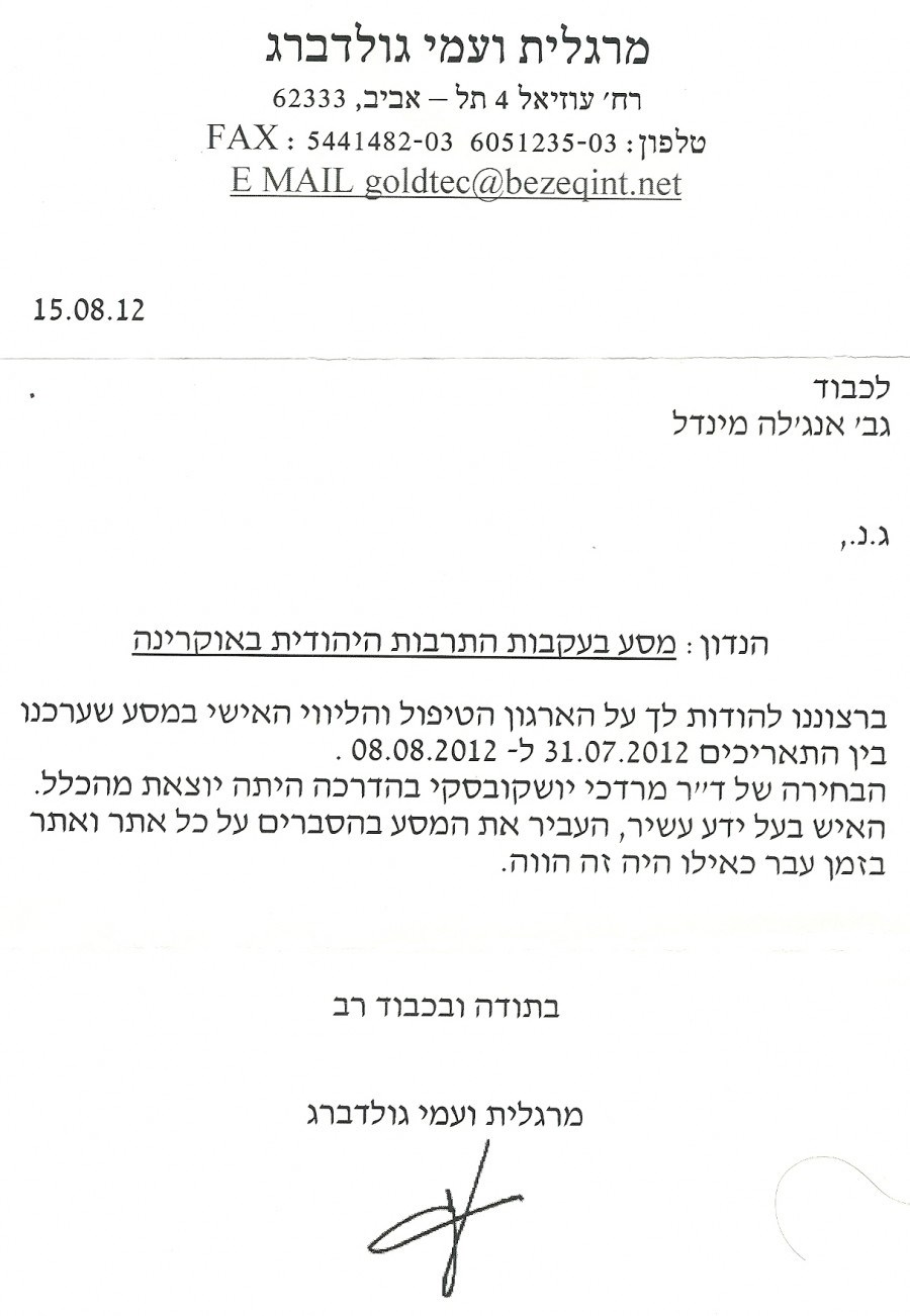 הדרכה: ההדרכה שלך הייתה רצינית, ממוקדת, עמוקה עתירת ידע ומידע, שניתנה לנו ללא לאות או מעצורים כל הזמן. עמדנו משתאים כיצד דברת בערך 10 שעות במשך היום, גם באתרים וגם באוטובוס עת גמענו את מרחביה של אוקראינה, וגם ''בין לבין' שוחחת עם החברים. ניכר היה כי עשית מאמצים רבים להקיף את ההווייה היהודית על כל צדדיה ורובדיה, הגשמיים, הרוחניים, התרבותיים, החיוניים הייחודיים. כך שמדנו רבות רבות.